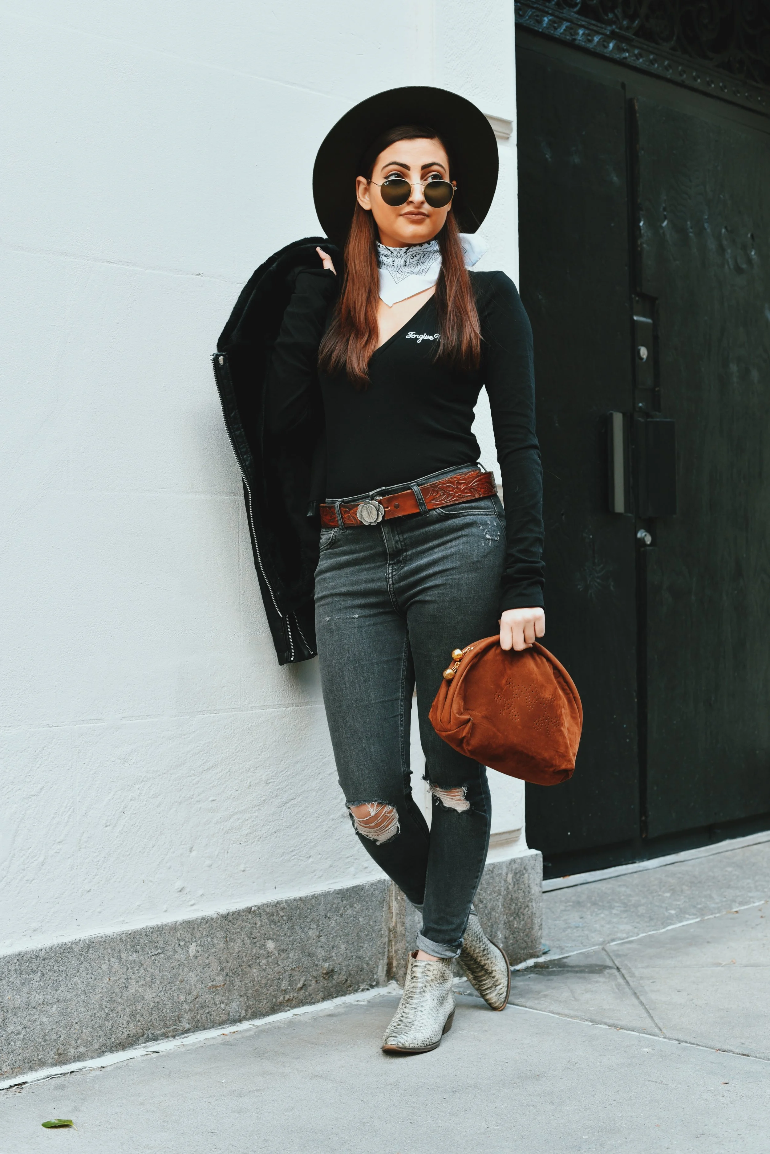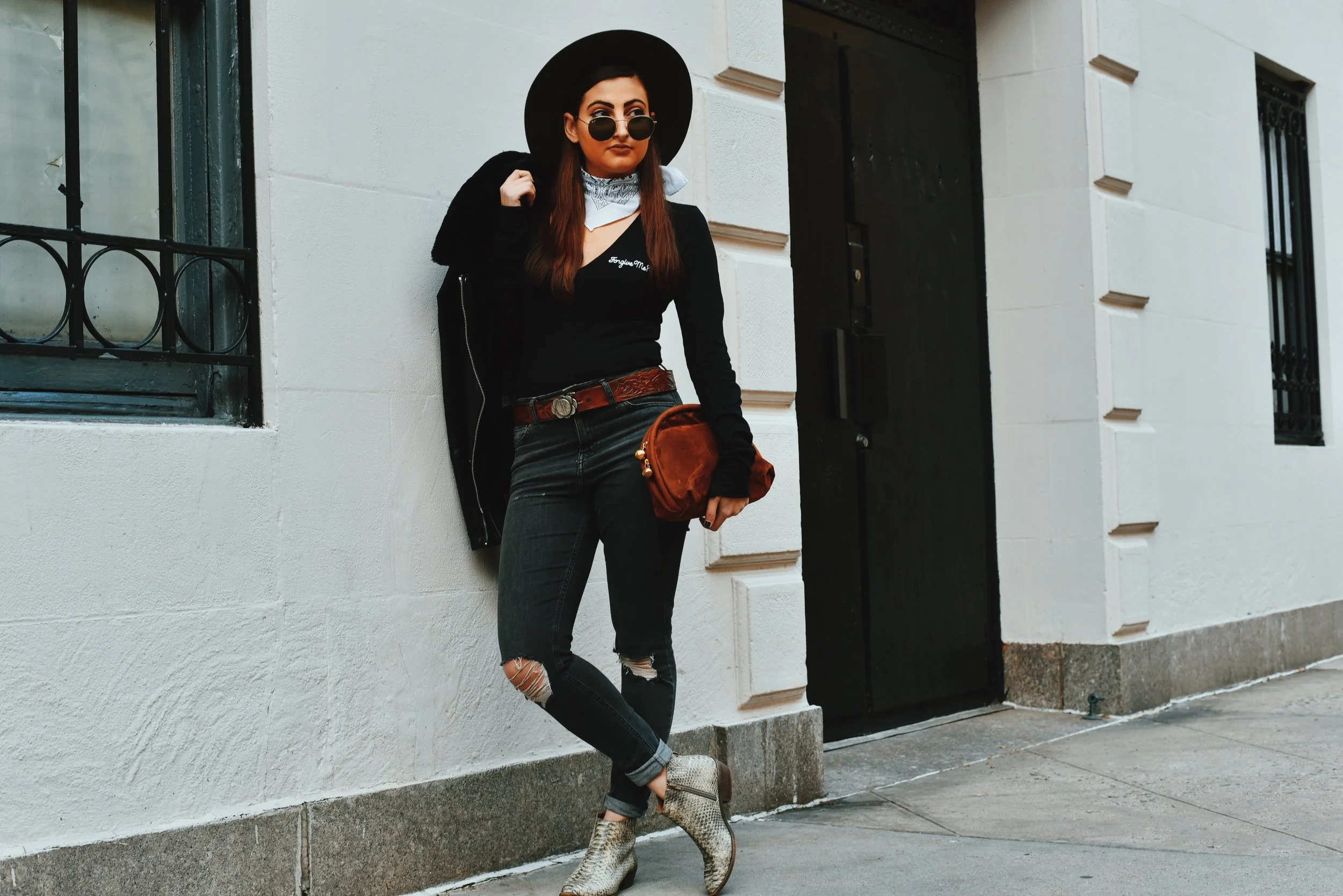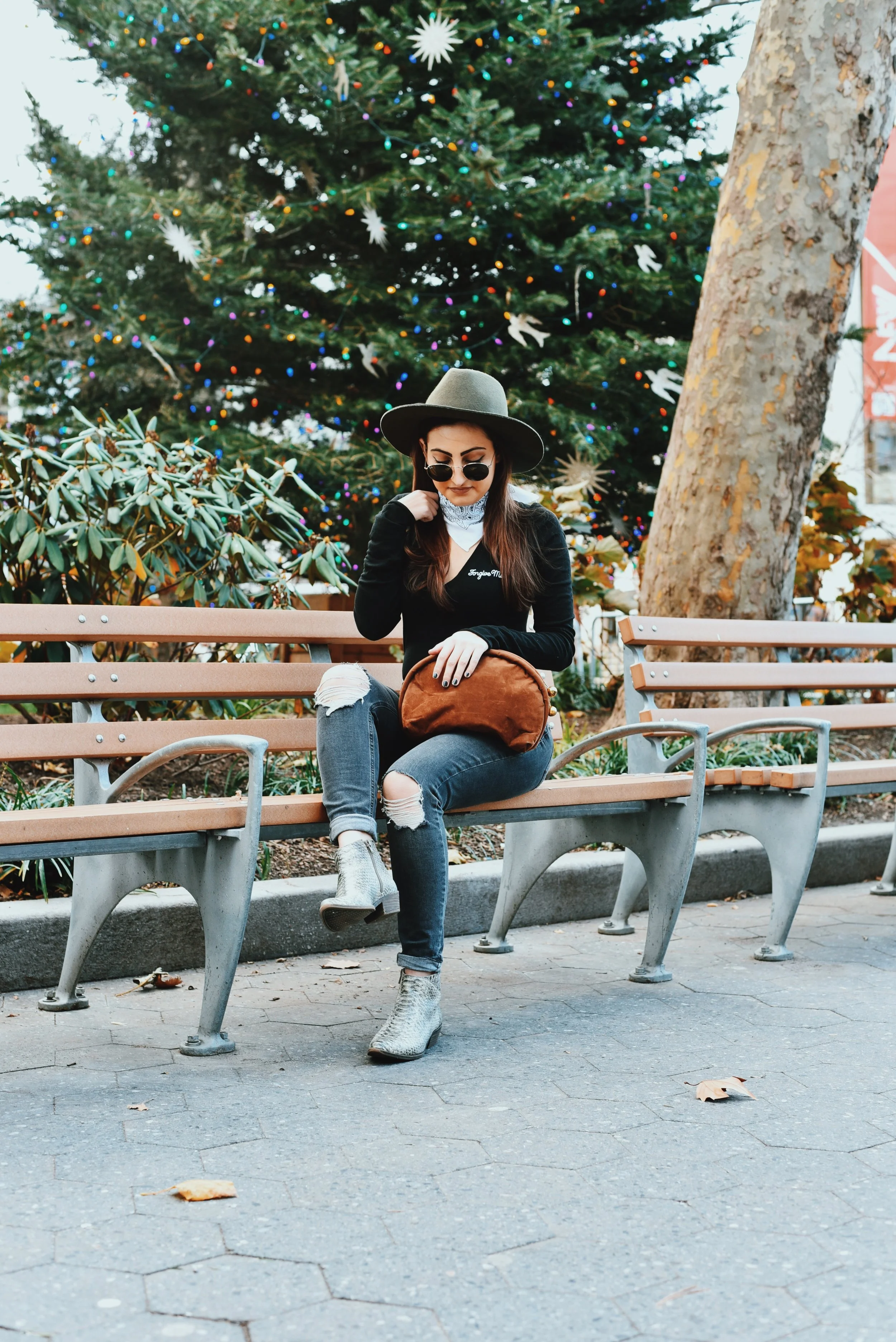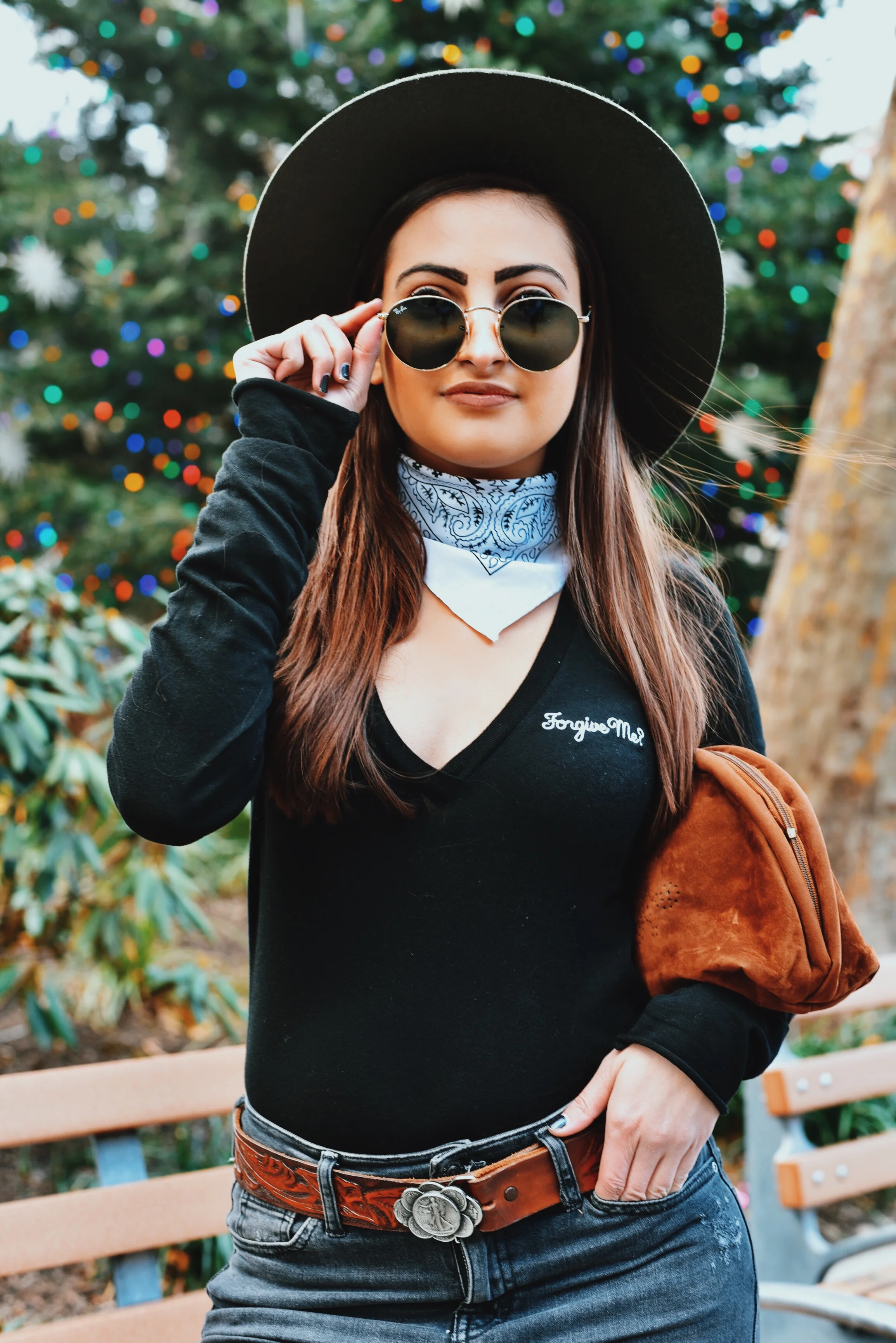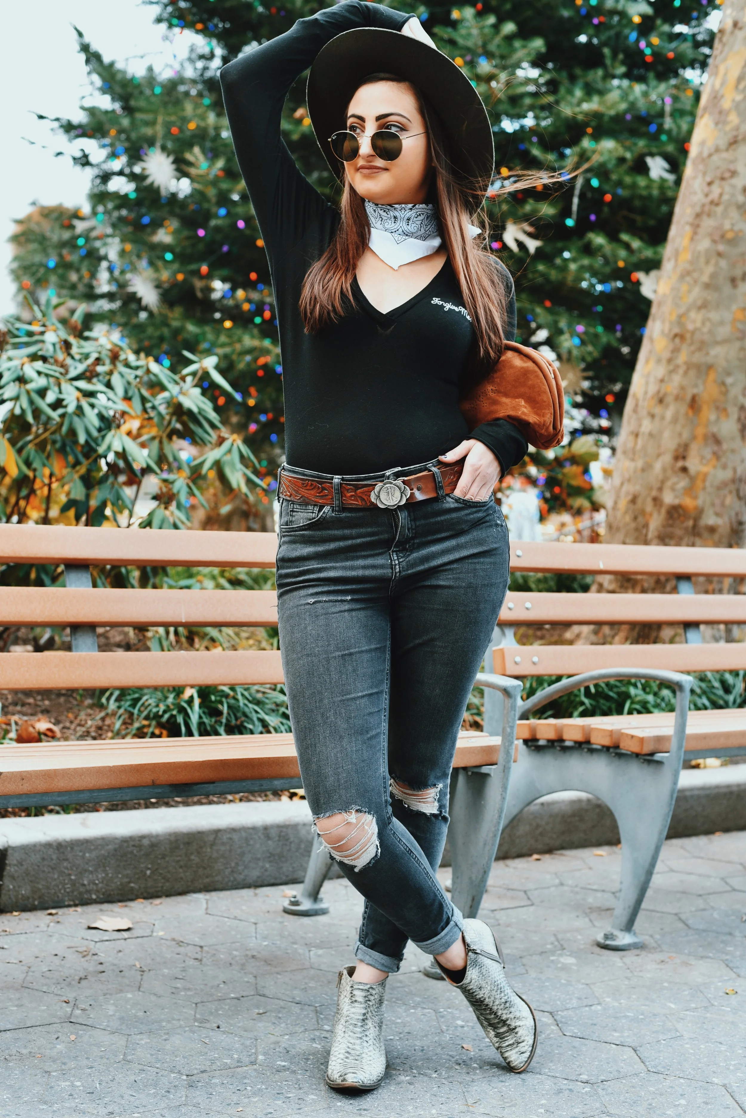 To mimic Ralphie's western wear (you know, the part where he's fantasizing about rescuing his family from burglars with that BB gun), I started with some dark Pacsun ripped jeans. I paired it with this new Wildfox bodysuit I purchased from REVOLVE, that I'm absolutely in love with -- (yes, it says 'Forgive Me?' which I thought was funny, and somewhat appropriate for a post where I'm discussing BB guns). Next, I added a vintage belt I picked up at a thrift store in the East Village a couple of years ago (I was even told that that's a real quarter dollar on the buckle), and paired that with a simple white bandana around my neck and this super cute hat from Volcom. I finished the look off with a velvet clutch I stole from my Mom's closet, and these sweet Lucky Brand faux snakeskin boots I found a while back. Many kudos to this background tree which is in Lincoln Square.