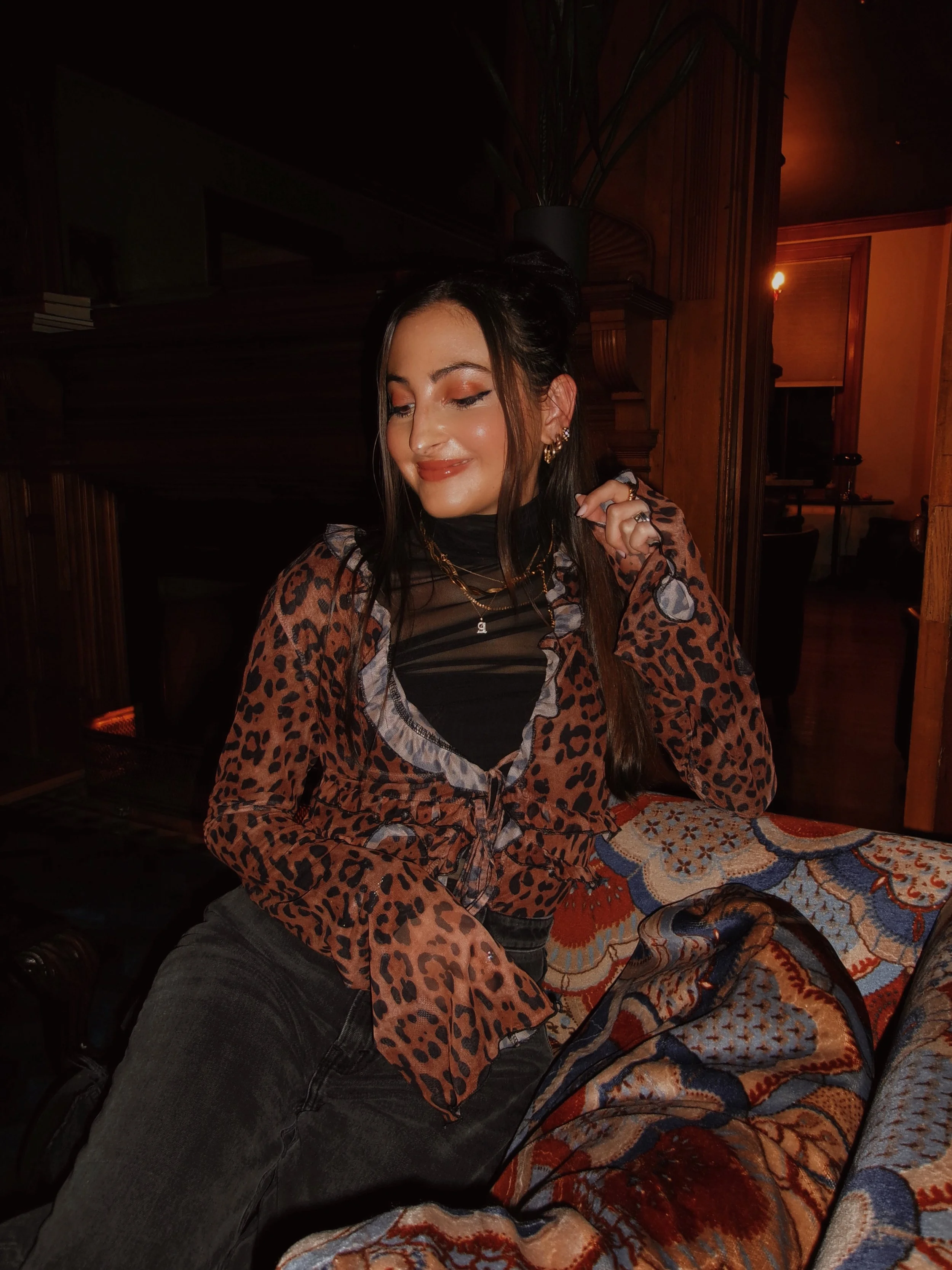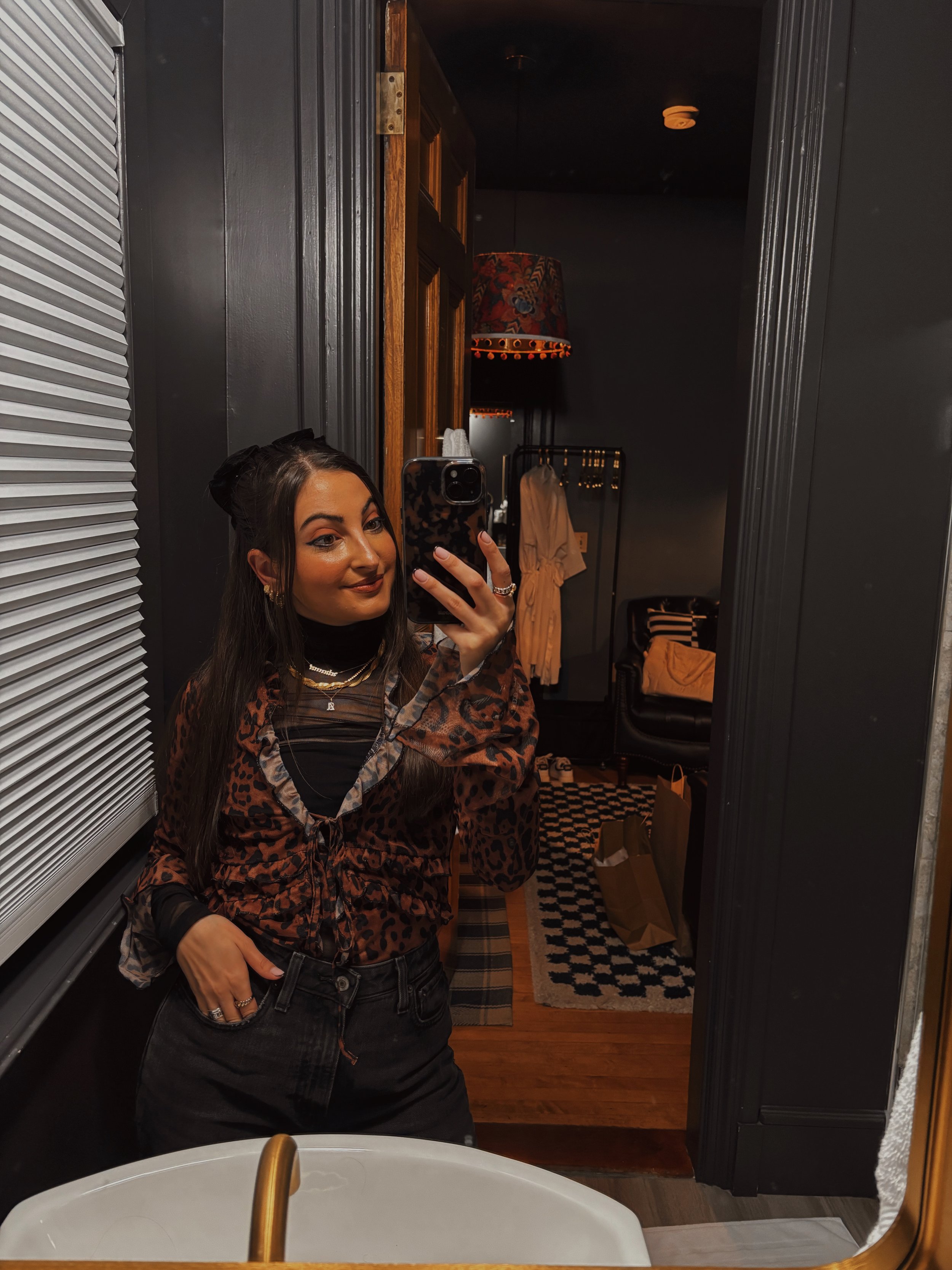 Styling going out clothes in cold weather is hard— so a little trick I like to lean on is pairing a fun blouse or tank top over a black turtleneck. I started with this Free People Under It All Bodysuit in Black (which by the way, is one of my favorite items I own in my winter wardrobe). Next, I added this cute Leopard Print Bell Sleeved Blouse over top from Amazon Fashion. Fair warning, the brown is a lot more * red * in person, so keep that in mind of you purchase. It added a cool layer of texture on top that’s fun and a little flirty without being overly girly. Next, I paired them both with my favorite Abercrombie High Rise 90s Jeans and a Black Velvet Bow.