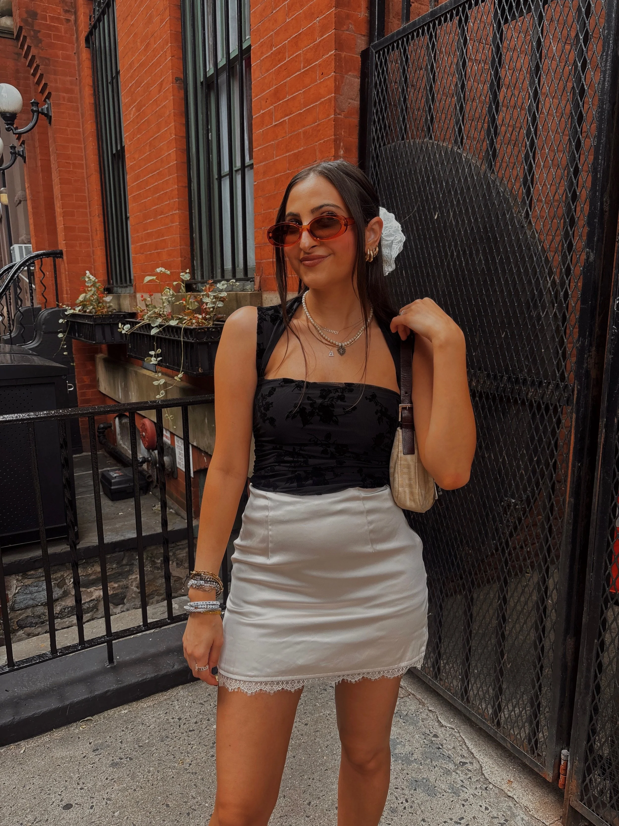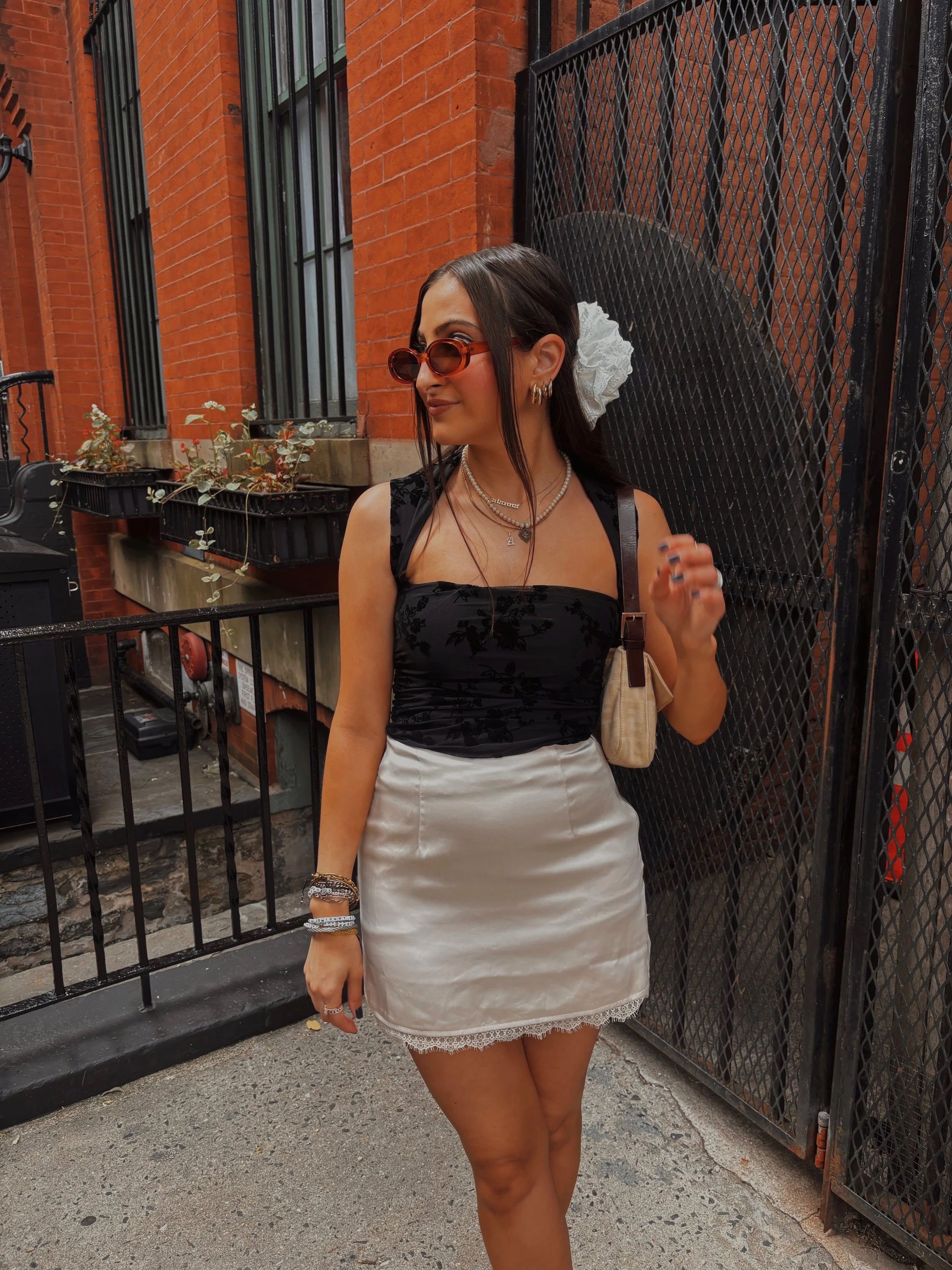 Like my time wearing eyelet as one of Macbeth’s not-so-innocent witches, I loved wearing this eyelet headpiece with a more edgy outfit. I paired it with this really cute Ava Mesh Top from Abercrombie that has black velvet flowers on it (truly great for all seasons tbh), and 1/2 of this Princess Polly Satin Skirt Set. I then added some oval sunnies and these really cute (and COMFORTABLE!) Amazon Jelly Kitten heels, and of course, the infamous Eyelet Scrunchie (similar here). If it were Fall, I’d pair this look with black cowboy boots, and a leather jacket (can you tell I can’t wait for Fall!) Case in point: eyelet doesn’t have to be as innocent as it looks, and for that, I’ll forever love it.