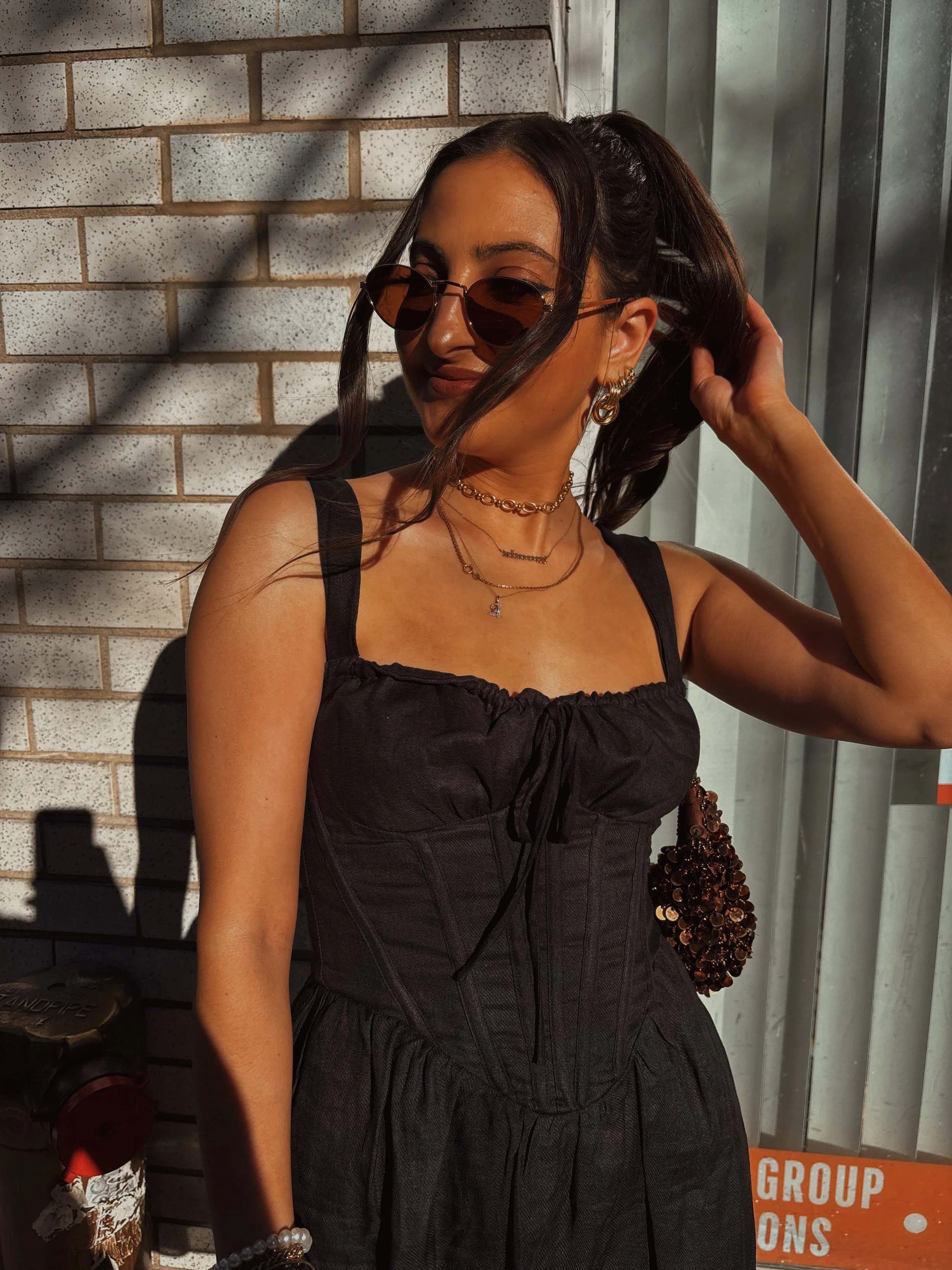 The answer was definitely this Esra Mini Dress from Bardot. Matte black fabric and this stunning corset detail had me totally sold. It has a flattering fit but doesn’t squeeze your stomach, making it super comfortable. I paired it with strappy Jeffrey Campbell flower heels (though strappy heels like this would go great too), and a sequin brown bag I picked up at a market in Mexico City a few months back (similar here). Tie that all together with some chunky gold jewelry, a choker, and brown sunnies, and I was off.